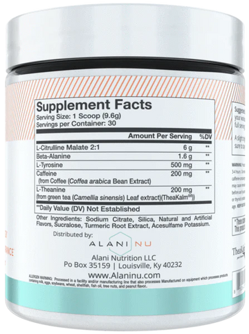 Alani Nu Pre-Workout is formulated around one specific principal... very simple but extremely effective! This sensational formulation starts off with 200mg of caffeine, 200mg of L-Theanine, and 500mg of L-Tyrosine to provide a smooth and sustaining energy source that will help maximize your workouts and boost energy levels without compounding too many stimulants that can leave you feeling anxious, nervous, or jittery, as well as increase adrenaline and dopamine which uplifts mood, and improves mental clarity and focus. This combination also helps to prevent the dreaded mid or post-workout crash that can not only ruin your workout, but the rest of the day as well.