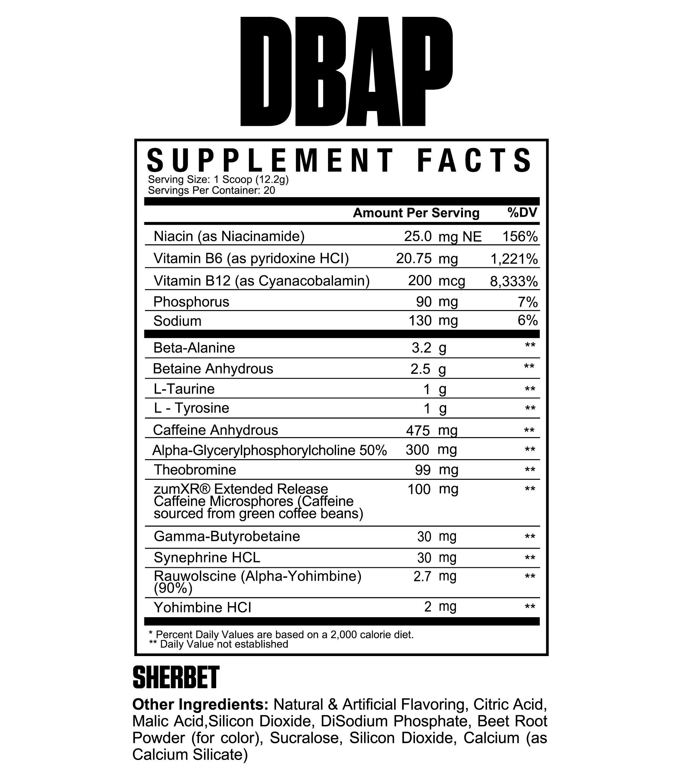 DBAP is a colossal combination of a high-powered, extreme-stimulant pre-workout and a hard-hitting, high-powered thermogenic. Each serving comes LOADED with a staggering dose of caffeine at 550mg, along with a robust stimulant blend consisting of Theobromine, Synephrine HCL, Alpha Yohimbine, and Yohimbine HCL. This combination delivers an ASTOUNDING level of energy that will have you seeing sounds, and will also last throughout the entire workout so you can surpass maximum intensity!