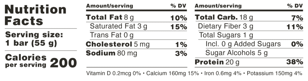 Each 55g bar delivers 200 calories packed with 20g of protein (40% DV) to fuel your day. With only 7g of total fat (9% DV) and 3g of saturated fat (16% DV), it's a heart-healthy choice. Carbohydrates come in at 20g (7% DV), including 3g of dietary fiber (10% DV) and a minimal 1g of total sugars. No added sugars ensure a guilt-free indulgence. Essential micronutrients include Calcium at 140mg (10% DV), Iron at 0.5mg (2% DV), and Potassium at 130mg (2% DV). The bar is low in sodium (75mg, 3% DV) and cholesterol (10mg, 4% DV).