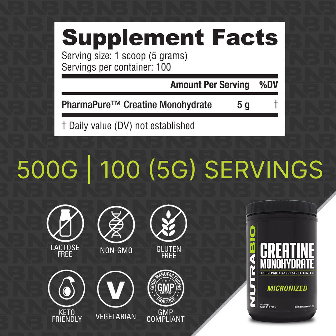 NutraBio Creatine Monohydrate Powder - 500g