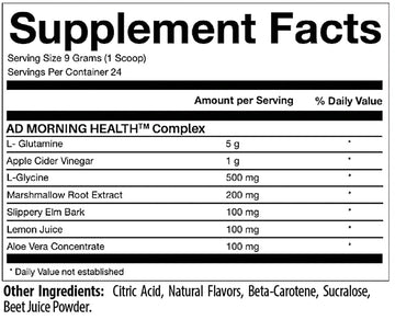 Boost your gut health and digestion with Project AD Life Good Mornin'! This unique blend of apple cider vinegar, lemon juice, l-glutamine, and aloe vera juice supports a healthy gut and cleanses the digestive tract. Start your day strong and set yourself up for success with Good Mornin'!