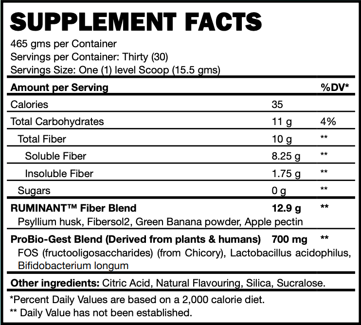Fiber+ is a comprehensive source of soluble and non-soluble fiber stemming from all-natural, high quality sources like Psyllium Husk Powder, Fibersol 2 & Green Banana Powder packed into our "RUMINANT™ Fiber Blend". This innovative blend provides a plethora of benefits that are essential for athletes such as, regularized bowel movements, improved balance of good-to-bad cholesterol, stabilized blood sugar levels, and better nutrient absorption. On top of the numerous benefits already provided, we took it a step farther, and implemented a 700mg ProBio-Gest Blend consisting of 12 strains of powerful probiotics for maximum gut health and digestibility, and a strengthened immune system. The combination of these two blends creates a synergystic masterpiece to aid every athlete, from the elite to the weekend warrior!