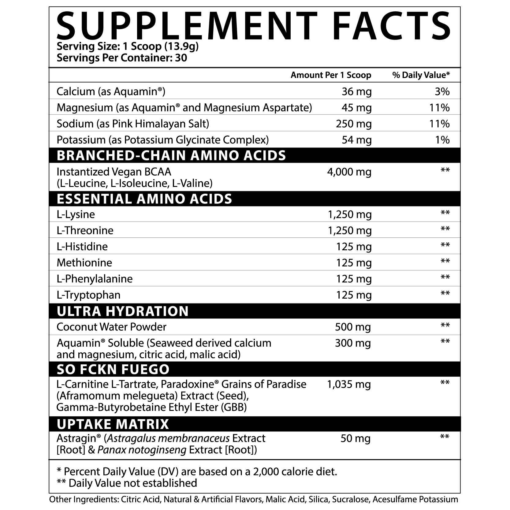 Directions: For best results, mix one serving (1 scoop) per 8-16oz. of cold water and drink during exercise. AMINO Fuego can also be taken before or after exercise, and throughout the day on training or non-training days.
