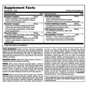 Directions: Take 2 packs a day for 3 straight weeks, 1 pack on waking & the other 4-6 hours later. Packs should be taken with a small meal and you should stay well hydrated while on the product. Follow a 3 weeks on, 1 week off cycle. After the week off, you can run it again. The Stimulant Complex is in the red capsule & the Water Shedding Complex is in the blue capsules.