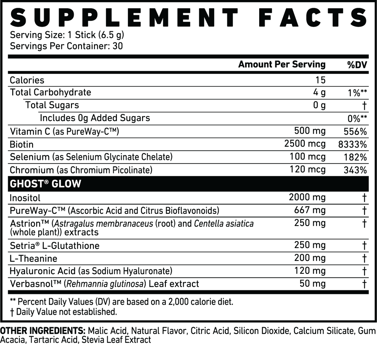Glow from the inside out with Ghost Glow Sticks, a revolutionary beauty and wellness supplement designed to support your skin, hair, and nails. Packed with ingredients like AstraGin®, Inositol, and L-Carnitine, these sticks work at the cellular level to boost your body's natural radiance. Whether you're battling stress, pollution, or the daily grind, Ghost Glow Sticks are here to help you shine. Perfect for anyone looking to support their fitness goals with a healthy, radiant appearance, these sticks are your new secret weapon.