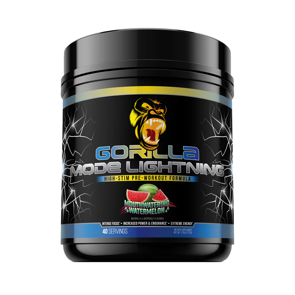 Unleash your inner beast with Gorilla Mode Lightning! Our highest-stim pre-workout delivers extreme energy, huge pumps, intense focus, stress resilience, and electrifying strength for increased muscular endurance. Plus, it tastes amazing. Don't just push your limits, shatter them with Gorilla Mode Lightning.