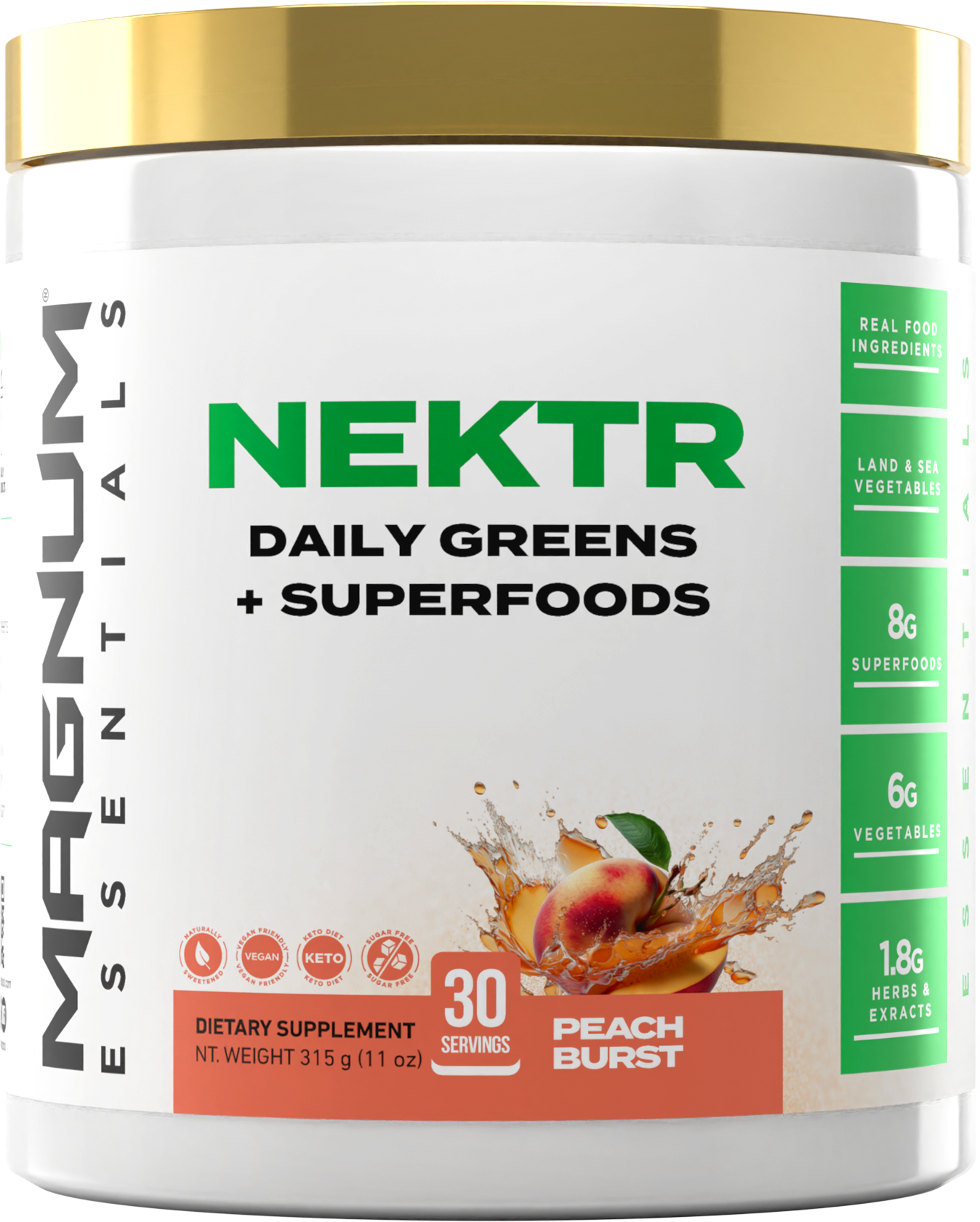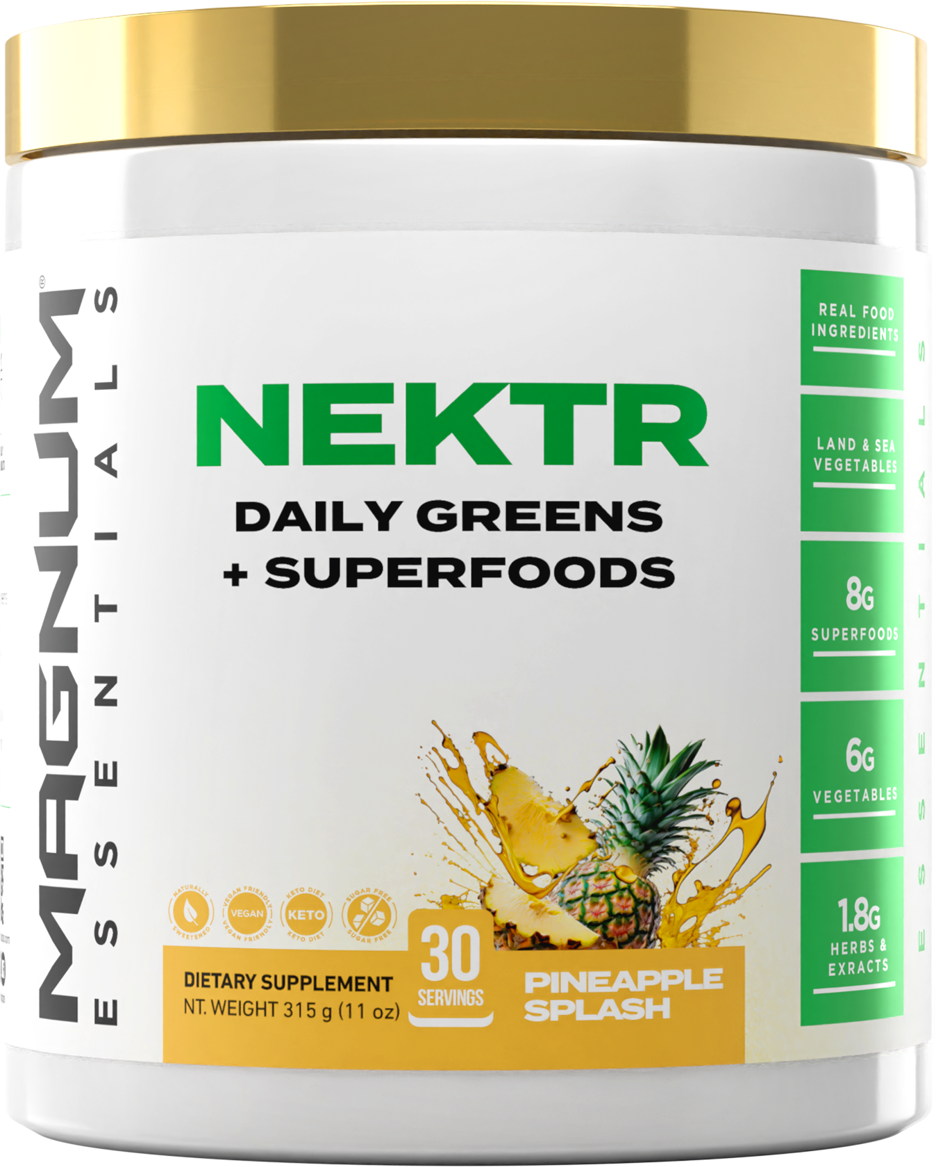 Magnum Nutraceuticals' Nektr Daily Greens is a potent fusion of 55 fruits and veggies sourced from land and sea, meticulously crafted for peak performance. Packed with micronutrients and antioxidants, Nektr delivers a burst of flavor while fueling your body's energy metabolism and providing essential vitamins, minerals, and fiber. Its balanced blend, featuring digestive enzymes and gut support, ensures improved bowel regularity, reduces inflammation, and keeps blood pressure in check. Plus, with added liver support and boosted energy production, Nektr is your go-to elixir for elevating your game... nourishing not just your body, but your mind and spirit too.