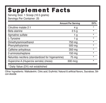 Directions: As a dietary supplement, mix one (1) scoop in 8-10oz. of water 30 minutes prior to workout on training days, or first thing in the morning on non-training days. Due to extreme potency, new users may wish to assess tolerance with one half (1/2) scoop.