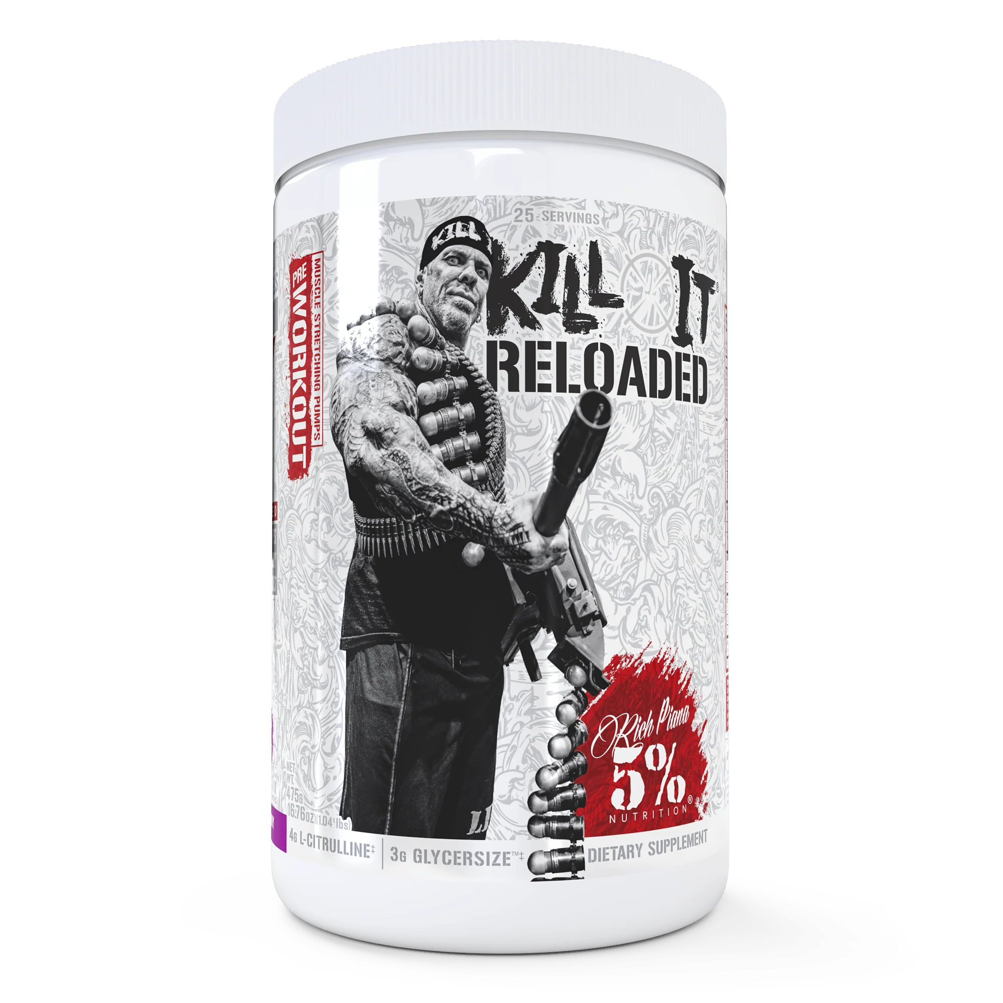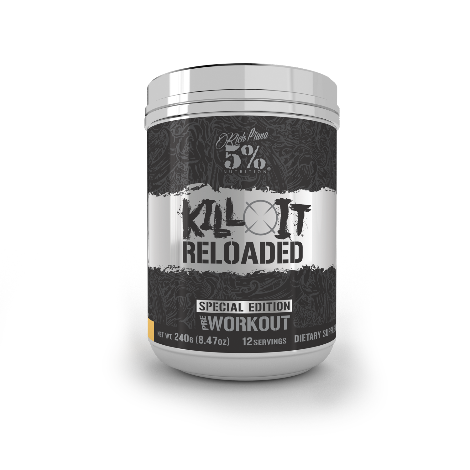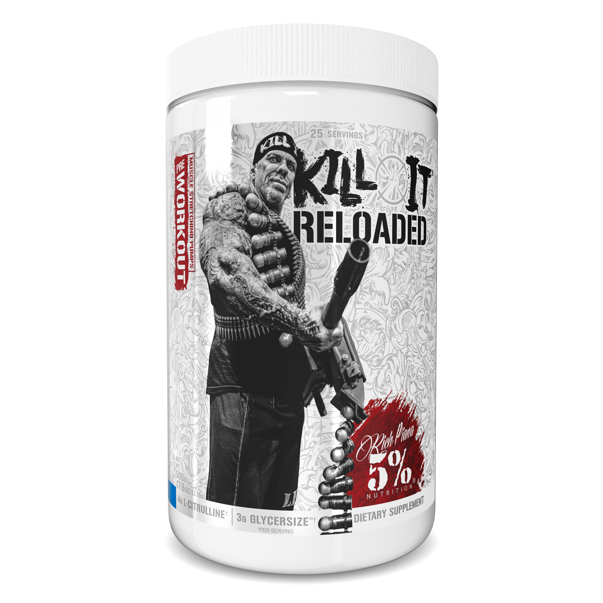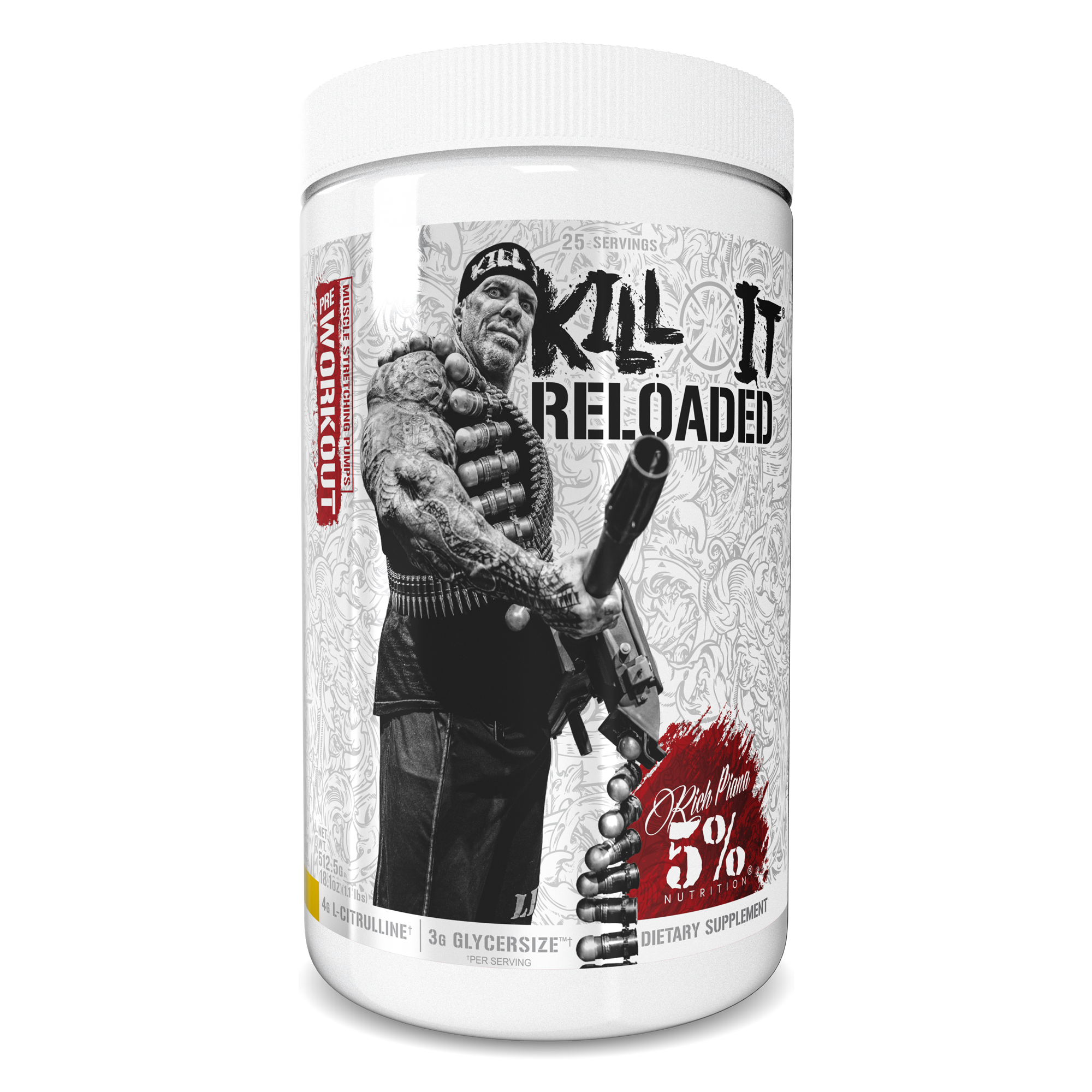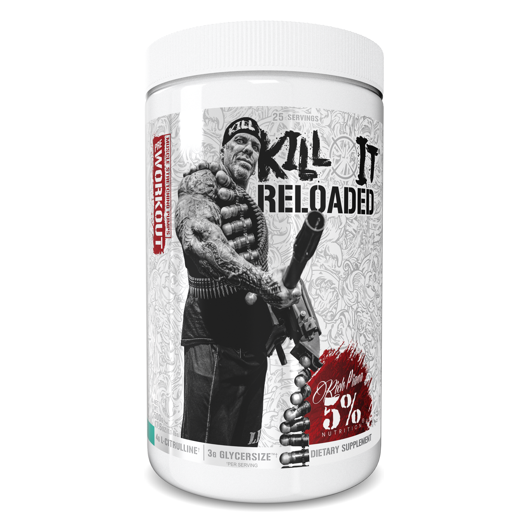 Kill It Reloaded is a very similar, yet more intense version of 5% Nutrition’s other top selling pre-workout, Kill It. Kill It Reloaded contains additional creatine to provide maximum endurance and increased strength, more caffeine at 325mg per serving for an immediate rush of energy with no crash, and a new nootropic blend to ramp up mental alertness and motivation. On top of that, Kill It Reloaded optimizes a high quality nitric oxide blend containing several ingredients such as the patented GlycerPump and L-Citrulline for skin splitting pumps. One scoop of Kill It Reloaded is all you need to take your workouts to new heights!