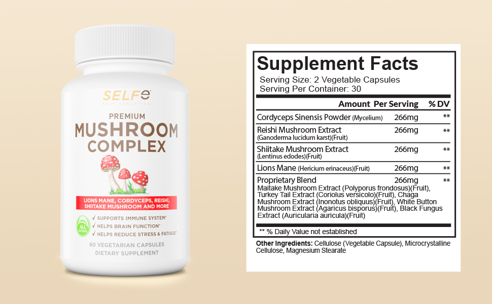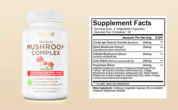 Mushroom Complex by SelfE contains nine different mushrooms that each present their own healing and health benefits, but also work very synergistically together to maximize all of these incredible benefits. The blend consists of Cordyceps Sinensis, Reishi, Shitake, Lion's Mane, Maitake, Turkey Tail, Chitaga, White Button, and Black Fungus. This potently-dosed blend delivers extraordinary benefits such as better quality sleep; reduced stress and anxiety; increased cognitive abilities such as focus, better mental clarity, decreased brain fog, and better memory; antioxidant powerhouses to help detoxify the body, ridding it of harmful toxins and free radicals; lower blood pressure and bad cholesterol; increased energy, athletic performance, and muscular recovery; and last, but most certainly not least, this blend packs a serious nutritional punch, boosting immune system health!