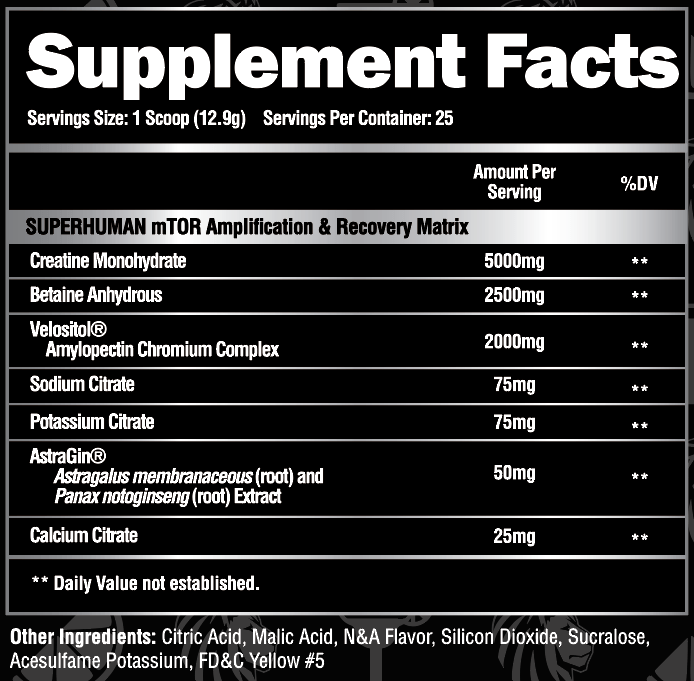 Superhuman Post is the trifecta of post workout recovery and is basically octane fuel for maximizing gains in lean muscle mass, strength, and power. This anabolic trio starts off with 5,000mg of Leucine (the king of amino acids when it comes to muscle building and repair) to stimulate muscle protein synthesis and inhibit muscle protein breakdown. thus activating muscle growth. Next Alpha Lion clinically dosed both Creapure (the purest form of creatine monohydrate) and Betaine Anhydrous. Creatine is the most studied and well-documented supplement in the industry. It has been proven time and time again to increase power output during intense exercise, drastically boost ATP levels to boost strength and power levels, increase athletic performance, as well as trigger muscle protein synthesis to promote muscle growth. Betaine Anhydrous is an osmolyte, meaning it increases cellular water retention through osmosis. This gives Betaine Anhydrous the distinct ability to cause muscle fibers to swell, which will also stimulate muscle protein synthesis, promoting muscle growth. Betaine also works very synergistically with creatine to increase creatine production and muscle cell uptake, which can significantly increase anaerobic power aka strength gains!