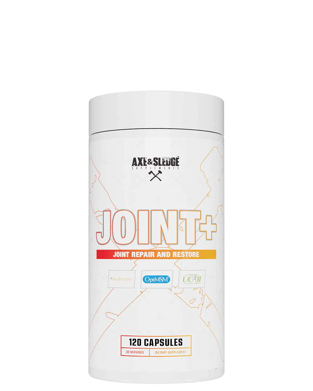 Introducing Axe & Sledge Joint+: your go-to solution for comprehensive joint health support. Joint+ is formulated with specific ingredients at clinical doses to enhance your flexibility, mobility, and overall comfort. Crafted with trademarked ingredients like UC-II® Undenatured Type II Collagen, OptiMSM®, and BioPerine®, this powerhouse formula is designed to keep your joints in top-notch condition. Whether you're hitting the gym hard, pounding the pavement, or just living life to the fullest, Joint+ has got your back (and your knees, and your elbows – you get the picture). So, if you're tired of feeling creaky and stiff, it's time to level up with Axe & Sledge Joint+ and reclaim your mobility, no matter your age, activity level, or goals. Trust me, your joints will thank you!