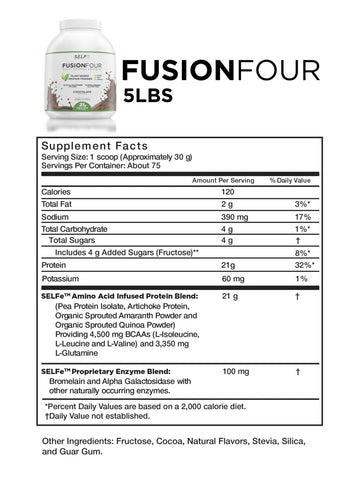 Fusion Four by SelfE is one of the cleanest proteins on the market today, sourced from four of the best all-natural plant based sources available (Pea Protein Isolate, Artichoke Protein, Sprouted Amaranth Powder, and Organic Sprouted Quinoa Powder), and is made from only 100% raw organic ingredients. Fusion Four supplies 21 grams of high quality protein per serving, contains all essential and non-essential amino acids including high amounts of BCAAs and L-Glutamine to facilitate muscle repair, lean muscle growth, strength, and energy. On top of the sensational protein blend, Fusion Four is also free of all major allergens including dairy, gluten, soy, and nuts; and is free of any substances banned by the International Olympic Committee, Collegiate, or Professional Sports Leagues; making Fusion Four the perfect choice for any level of athlete, or anyone looking for a healthy way to increase their daily protein intake. Oh! One last thing: the flavors are absolutely delectable!
