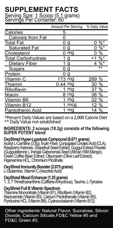 Oxyshred is a low stimulant based thermogenic that will invigorate your body's beta-3 receptor cells while boosting its metabolism to promote an increased level of fat burning. It does this without placing stress on your heart rate and blood pressure through a process known as "Hyper-lipolysis" which is a complex method of super efficient and enhanced burning of the subcutaneous fat molecules. This process, along with curbing your appetite, limiting calorie absorption, supporting immunity, and providing naturally boosting energy is why Oxyshred is one of the most effective and top selling fat burners on the market today!