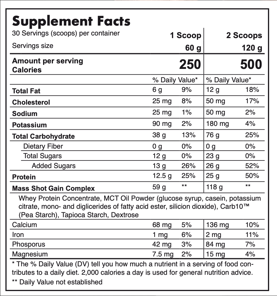 Directions: As a dietary supplement, mix one (1) scoop, or (2) scoops of Mass Chaser in as little as 4oz (100ml) of water depending on personal preference. AD Mass Chaser utilizes unique technology that allows you to mix up to 120 grams of powder in as little as 4oz (100ml) of water for the perfect high calorie addition to any diet. Suitable for men or women.
