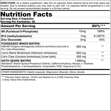 Directions: As a dietary supplement, take four (4 capsules when extreme focus and brain gains are needed. Due to extreme potency one may wish to start with 1-2 capsules before progressing to a full serving. Do not exceed recommended dosage in a 24-hour time period.