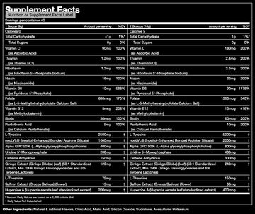 Each maximum dose of Respawn contains 5000 mg of L-Tyrosine, 2000 mg of nooLVL®, 800 mg of Alpha-GPC 50%, 400 mg of Uridine Monophosphate, 300 mg of Caffeine, 240 mg of Ginkgo Extract, 150 mg of L-Theanine, 30 mg of Saffron Extract, 400 mcg of Huperzine A, and a blend of 9 essential vitamins in their biologically active formats. Respawn is also free from sugar and artificial colors, and has an amazing taste.
