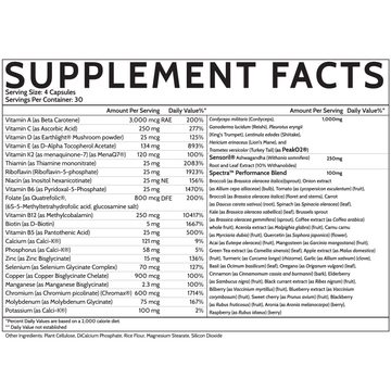 This vegan multivitamin is a comprehensive blend of 22 essential vitamins and minerals (19 offer 100% or more of your recommended daily value), PeakO2® organically-grown combo of six medicinal mushrooms, Sensoril® Ashwagandha, and Spectra™ antioxidant blend.