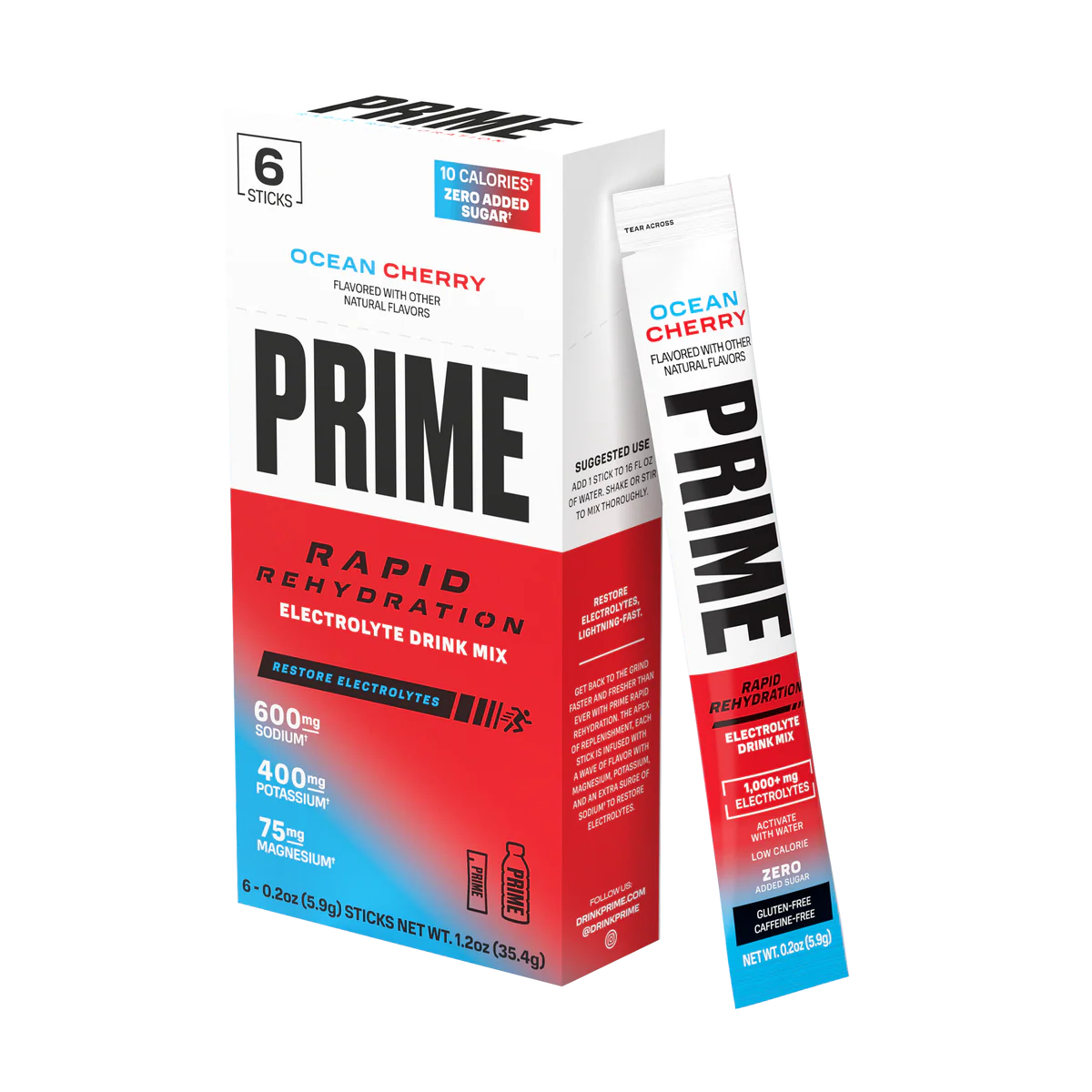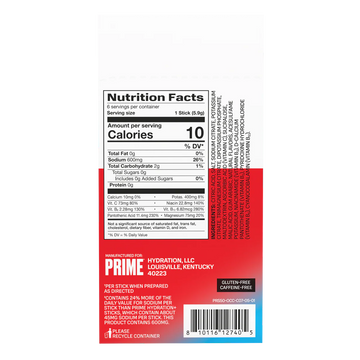 Prime Rapid Hydration Sticks deliver 1,085mg of essential electrolytes to support optimal hydration without added sugar. Each stick contains just 10 calories and is caffeine-free, making it an excellent choice for rehydration anytime. Convenient and easy to use, these sticks help replenish vital minerals quickly and efficiently, promoting balanced fluid levels and sustained wellness.