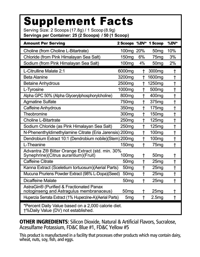 WARNING: This is an Extreme PRE! Start with 1/2 Scoop to gauge tolerance. FOCUS: 800MG Alpha GPC
