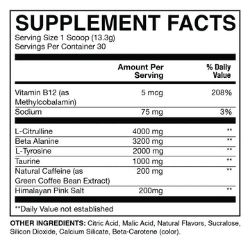 The CBUM Essentials formula includes 4g of pure Citrulline for excellent muscle pumps and faster recovery, 3.2g of Beta-Alanine to increase endurance and time to exhaustion, 1g of Taurine to optimize cellular hydration and maximize muscle function, 2g of Tyrosine for better mental focus and energy, 200mg of Pink Himalayan salt to support hydration and electrolyte balance, and 200mg of natural caffeine for sustained energy.