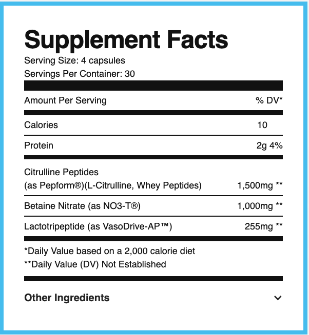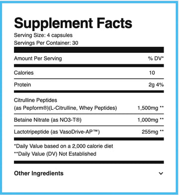Pump Cap Max contains a very potent and concentrated blend of Citrulline Peptides at 1.5 grams, Betaine Nitrate (as NO3-T®) at 1 gram, and Lactotripeptide (as VasoDrive-AP™) at 255mg. Now, I know that blend is very simple and doesn't seem very vast, but it doesn't need to be. The highly concentrated dose of each ingredient packs a huge punch for increasing vasodilation (blood flow), increasing plasma nitric oxide levels, boosting cellular hydration and ATP (the source of energy that is used to power the movement of contraction in working muscles), improving time to exhaustion, and enhancing peak power output.