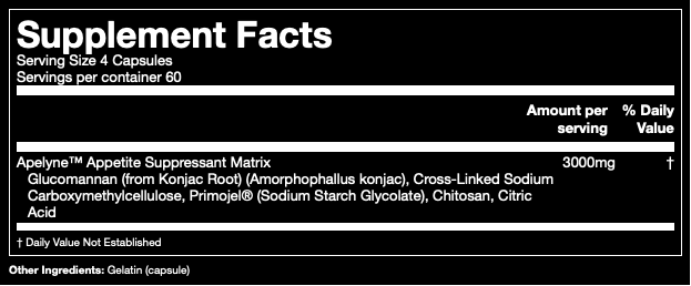 Directions: Take 4 capsules of Apelyne™ 20-30 minutes before each meal with water. After you take the capsules, drink 2 more glasses of water (16 oz/500mL). If you miss a pre-meal dose, take Apelyne™ with 16 oz of water during or immediately after your meal.