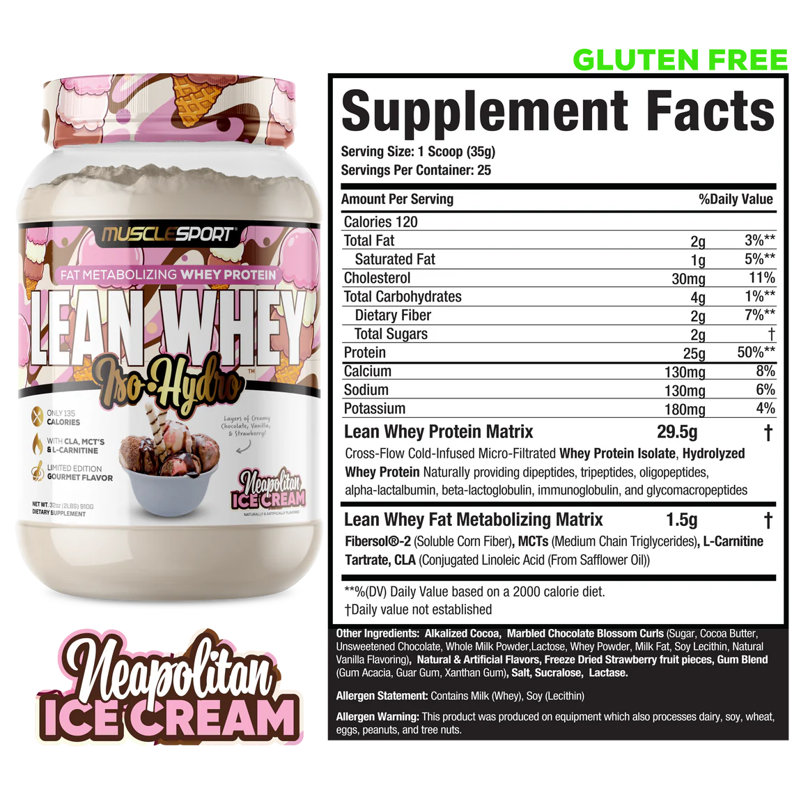 Lean Whey Iso-Hydro by MuscleSport contains a combination of Hydrolyzed Whey Protein and Whey Protein Isolate which are 2 of the highest quality, purest, and most bioavailable protein sources on the market! Each serving of Lean Whey provides a whopping 25 grams of protein per serving, and the flavors... well.. let's just say the flavors are unrivaled and beyond delicious! With flavors like Strawberry Ice Cream, Coconut Caramel, Toasted Almond, Italian Rainbow Cookies, and