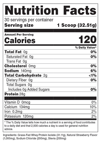 Ingredients: Grass-Fed Whey Protein Isolate (31.11g), Natural Strawberry Flavor (1,000mg), Sodium Chloride (200mg), Stevia (200mg)
