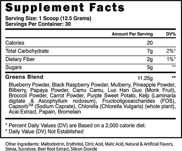 11.25 Grams: Blueberry, Black raspberry, Mulberry, Pineapple power, Bilberry, Papaya, Camu camu, Luo han guo (monk fruit), Broccoli power, Carrot powder, Purple sweet potato, Kelp, FOS, Chlorella, Papain, Bromelain, PQQ, Acai extrac.