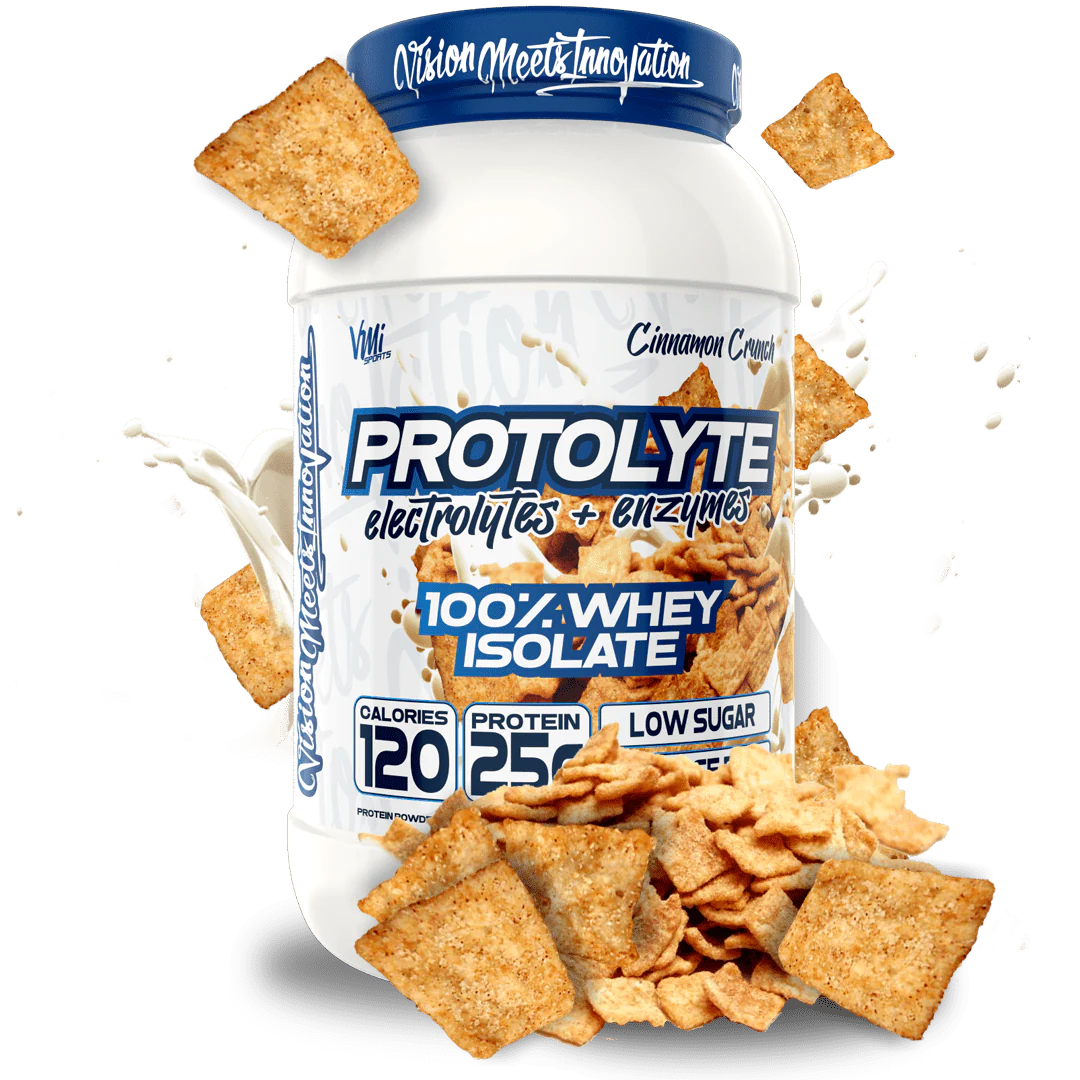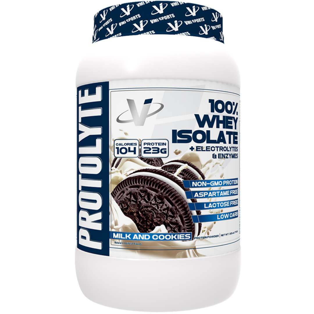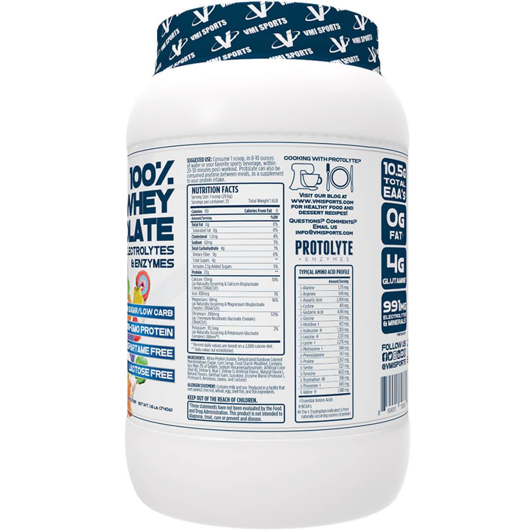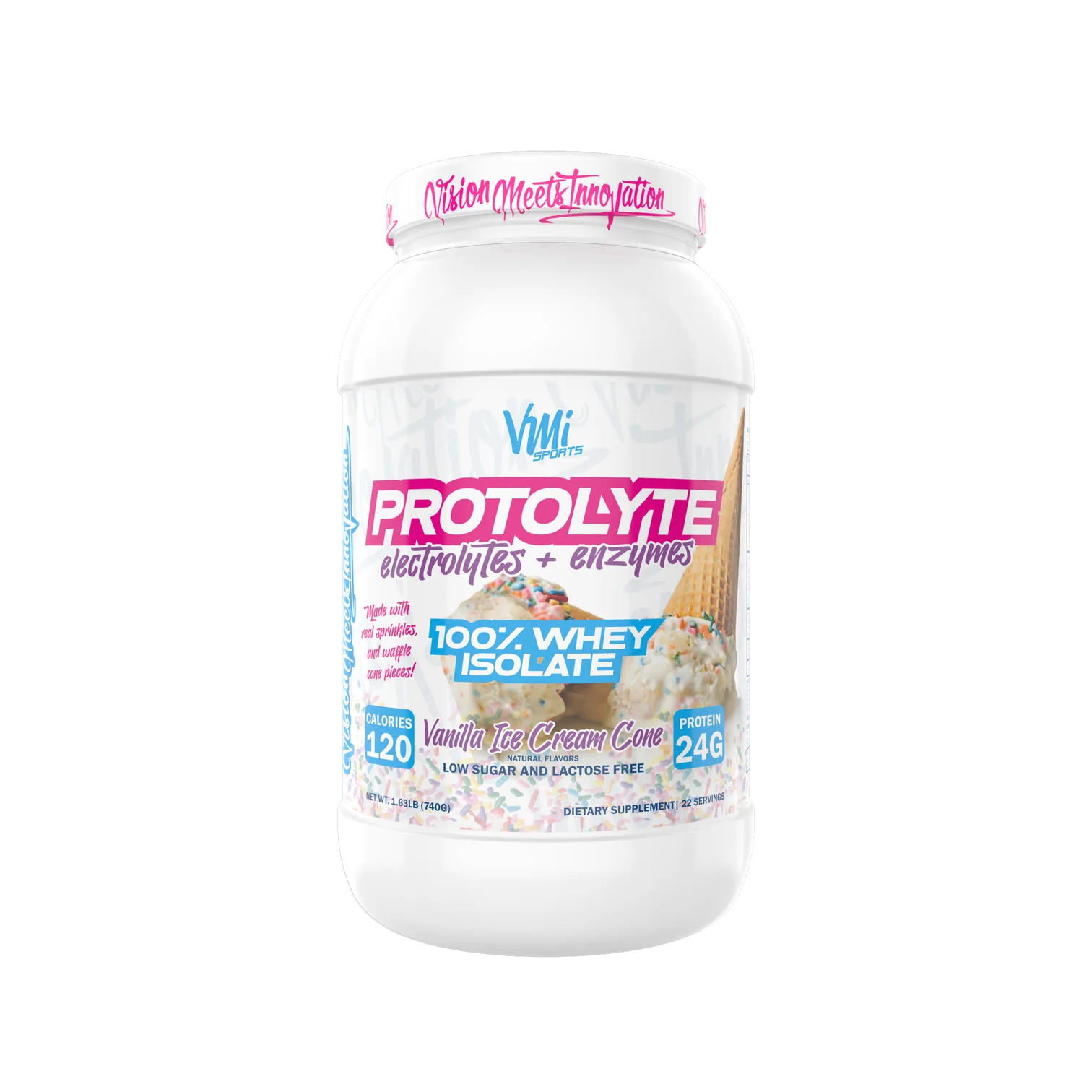 VMI Sports Protolyte 100% Whey Isolate Protein VMI Sports has rolled out a unique cutting edge formula with Protolyte 100% Whey Isolate Protein. VMI Sports has added both electrolytes for hydration, as well as powerful enzymes. If you're looking for a lean protein supplement that will provide you with gains, as well as incredible post workout recovery, look no further, you've found it. VMI Sports Protolyte Highlights 23 Grams Protein ONLY 105 Calories With Electrolytes & Enzymes Promotes Muscle Protein Synthesis Great For Post Workout Recovery & Hydration Repair Muscle Tissue Tons Of Tasty Flavors To Choose From Whey Protein vs. Whey Protein Isolate Whey Protein Isolates undergo more processing which results in a higher protein content with less carbs, less lactose, and less calories. Those who are calorie or carb conscious tend to like Whey Isolates. Whey Protein formulas typically are thicker and have a better taste. When Should I Take VMI Sports Protolyte Whey Isolate? If your goal is to build muscle, its best to consume 20-25 grams of protein immediately upon completing training. How Do I Take VMI Sports Protolyte?