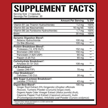 5% Nutrition Digestive Enzymes is your secret weapon for unlocking the full potential of your diet and supplements. To maximize the benefits of your carefully calculated macronutrient intake, you need to optimize digestion, and that's where Digestive Enzymes comes in. This powerful supplement boasts full disclosure labeling and exceptional dosing to ensure your digestive system functions at its best. With a comprehensive blend of seven enzyme complexes, including protein breakdown, carbohydrate digestion, fat breakdown, fiber breakdown, and lactose digestion, Digestive Enzymes supports efficient nutrient absorption, so you get the most out of every bite. Whether you're a bodybuilder, powerlifter, or just committed to your fitness journey, Digestive Enzymes is your key to making the most of your hard work and dietary plan. Start maximizing your results today with 5% Nutrition Digestive Enzymes.